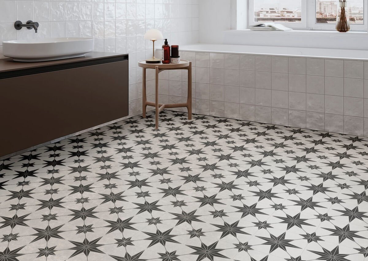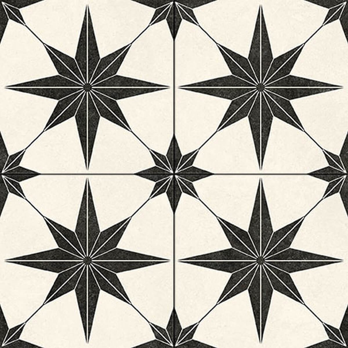 The matt finish provides comfortable underfoot traction while the repeating star motif creates visual rhythm without overwhelming neutral schemes. As a single-face design, it delivers consistent patterning across installations, enhanced by the durability and low maintenance of porcelain construction.